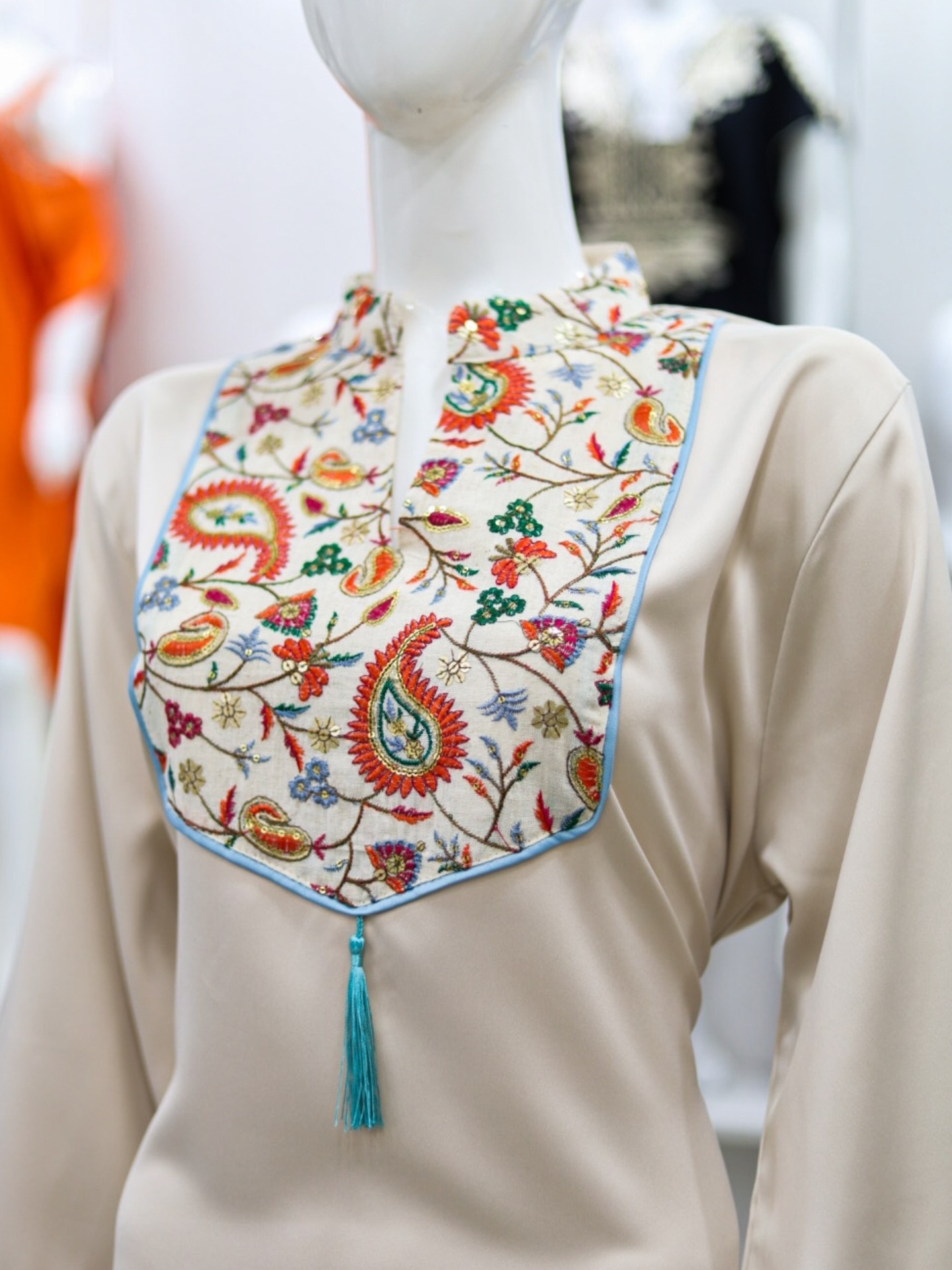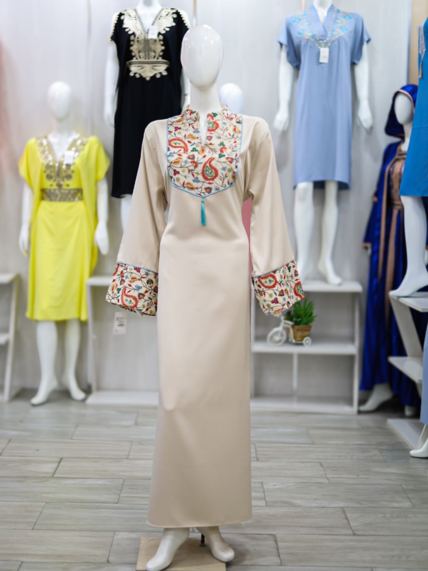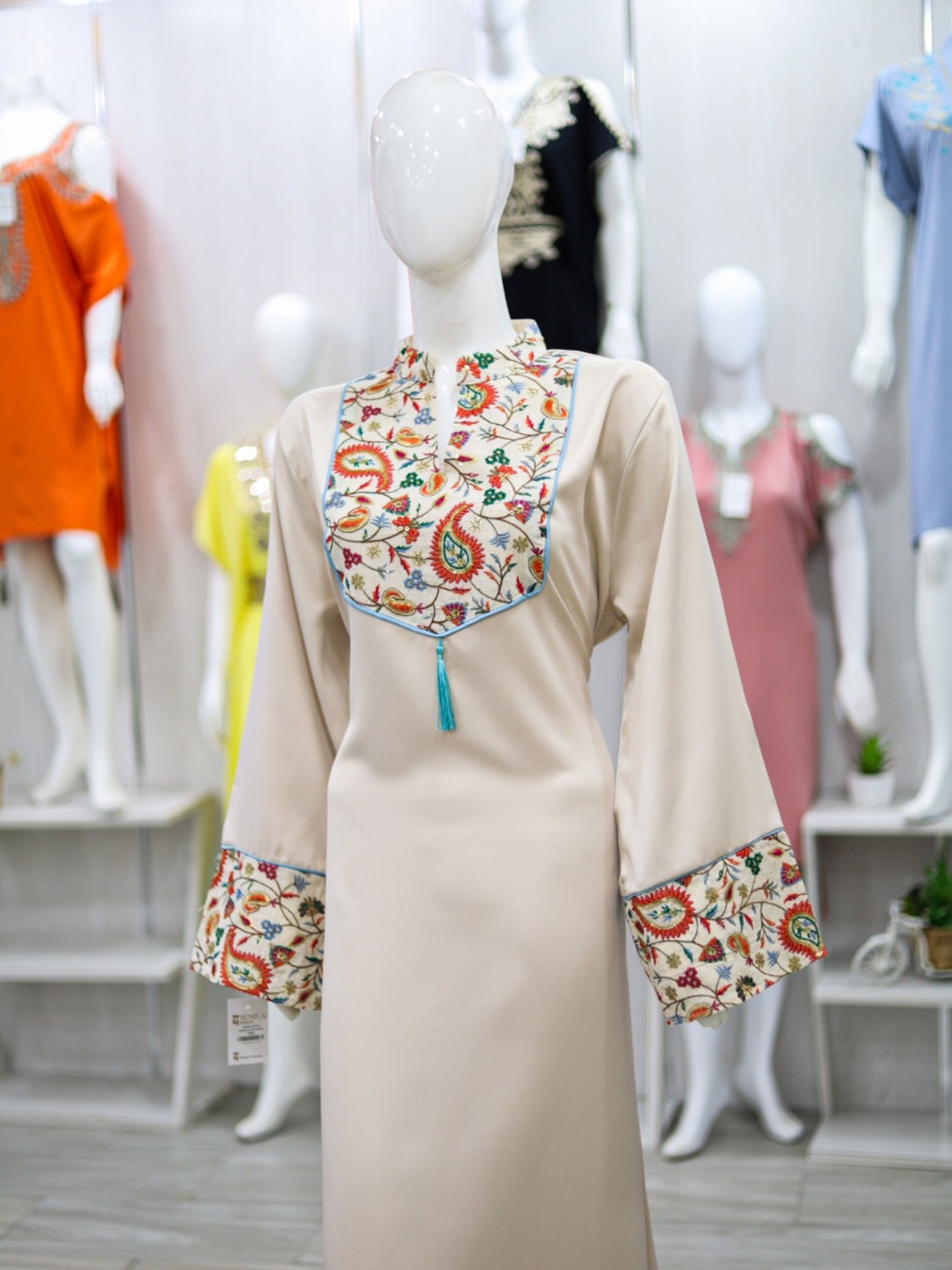 جبة تقليدية بلون بيج راقٍ، مزينة بزخارف مطرزة ملونة تضيف لمسة فنية مميزة.