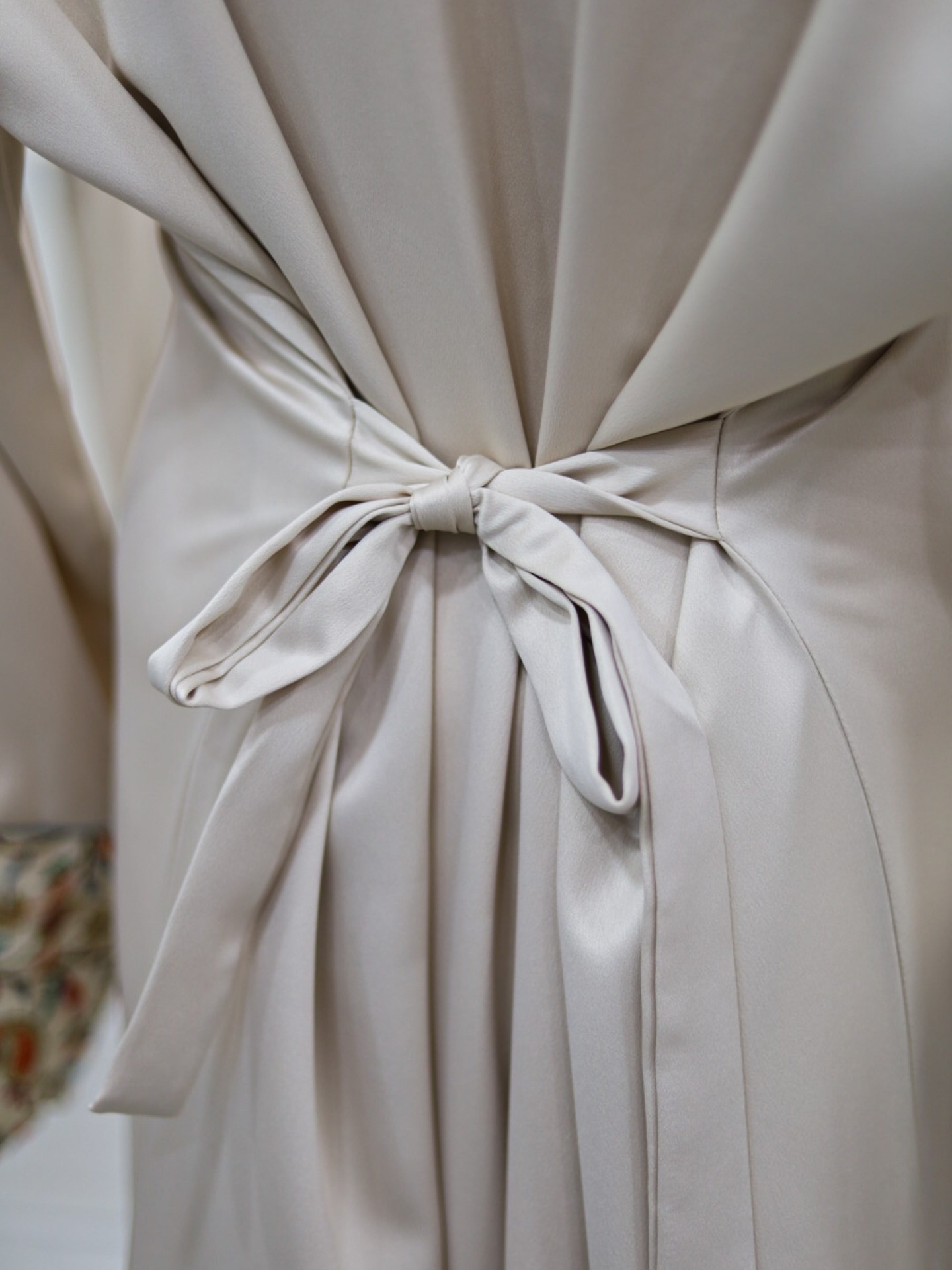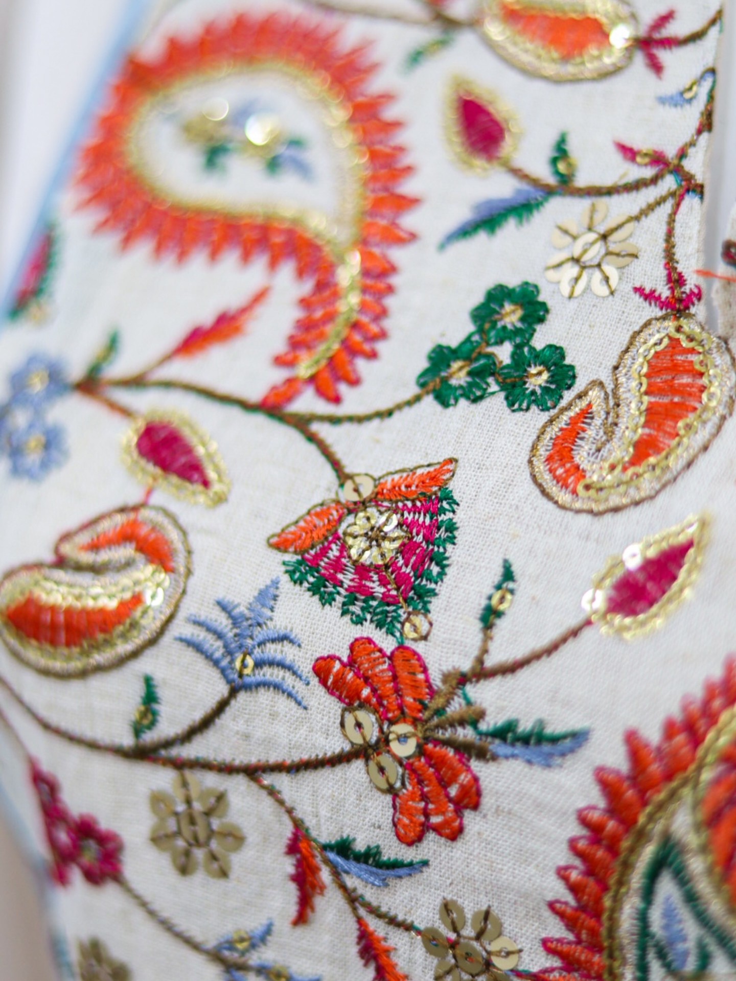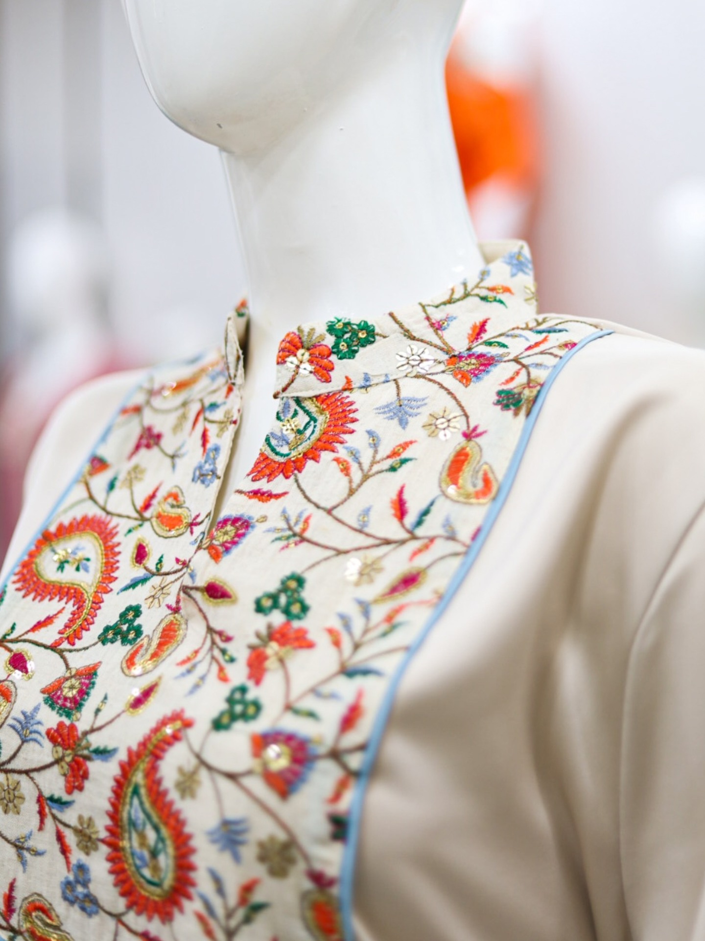 جبة تقليدية بلون بيج راقٍ، مزينة بزخارف مطرزة ملونة تضيف لمسة فنية مميزة.