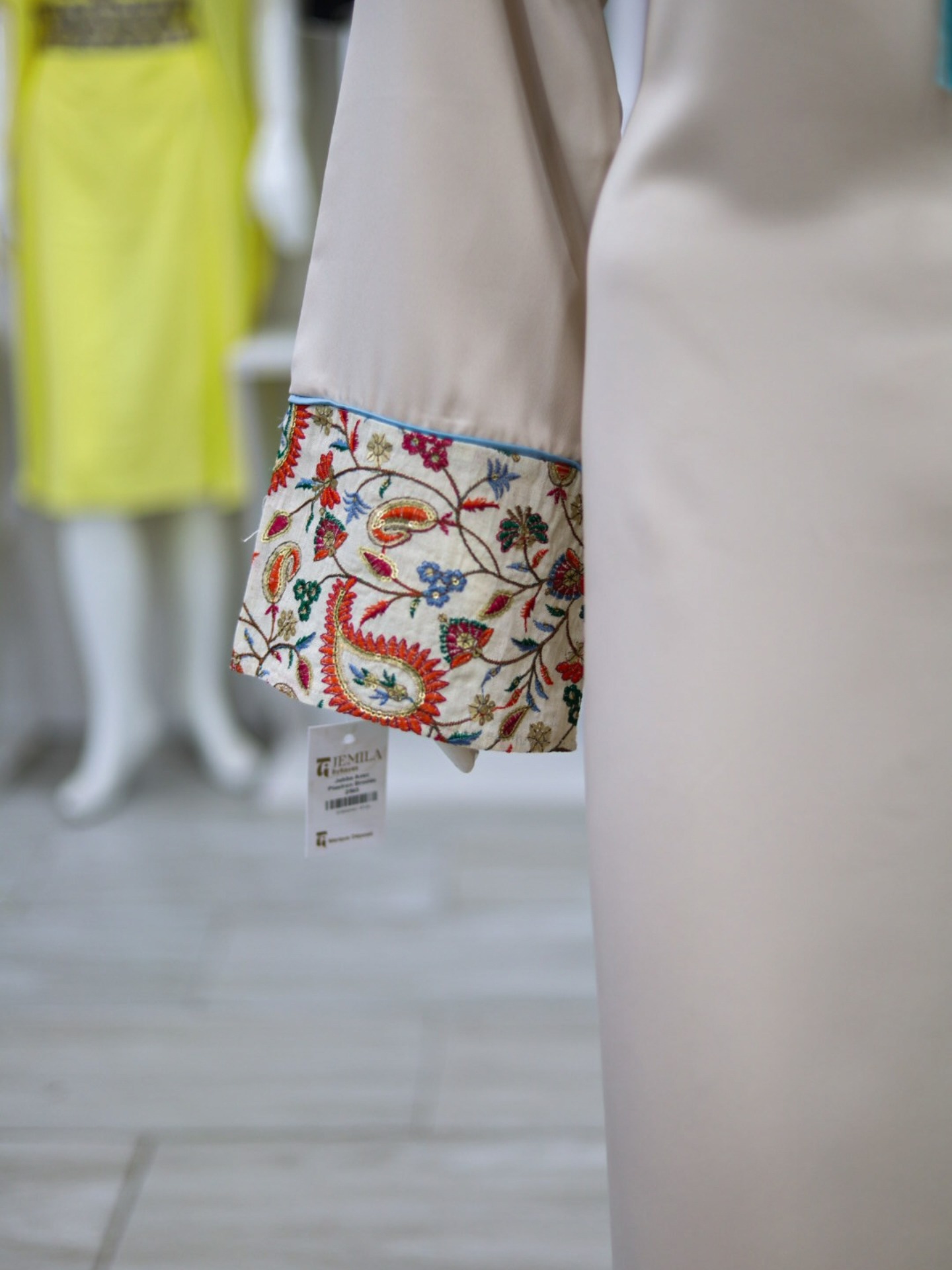 جبة مناسبات بيج أنيقة بتطريز ملون في الصدر والأكمام، طابع تقليدي عصري.
